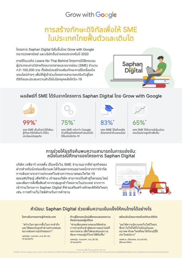 ซึ่งได้เป็นไปตามเป้าหมายที่ Google ได้ประกาศถึงความมุ่งมั่นในการสนับสนุนการเข้าถึงเครื่องมือดิจิทัล การเรียนรู้และใช้ประโยชน์จากทักษะดิจิทัลจากผู้เชี่ยวชาญ รวมทั้ง เพื่อช่วยผลักดันการฟื้นฟูเศรษฐกิจของผู้ประกอบการเอสเอ็มอีไทย และเพิ่มขีดความสามารถในการก้าวเข้าสู่เศรษฐกิจยุคดิจิทัลอย่างยั่งยืน
