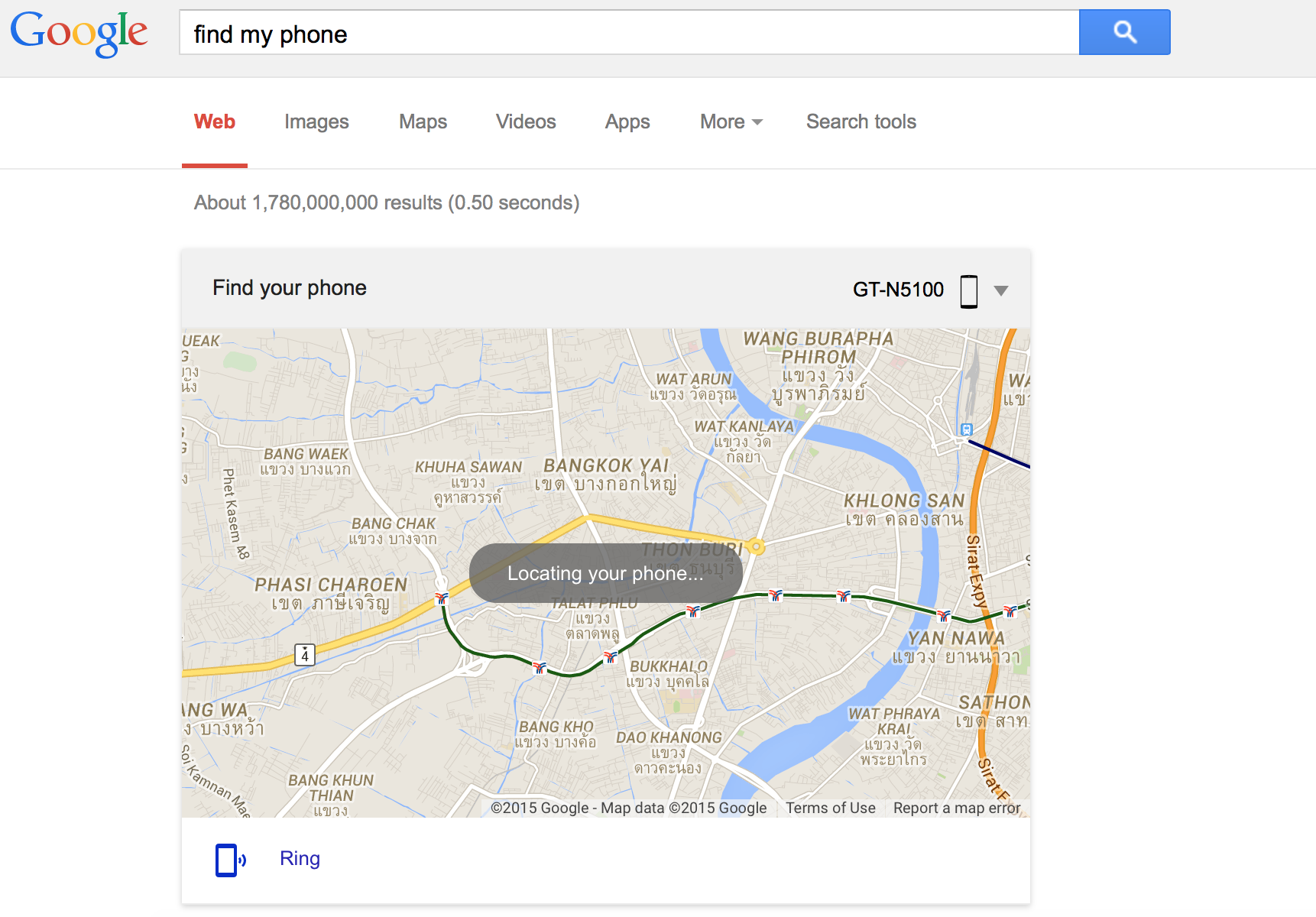 หากจะเริ่มต้นการใช้งาน ก็เพียงแค่เปิดหน้าเว็บ Google ขึ้นมา แล้วพิมพ์คำว่า Find My Phone เพื่อให้ระบบแสดงแผนที่เพื่อระบุตำแหน่งของโทรศัพท์ในเวลานั้น และถ้ามันอยู่ใกล้ๆ ผู้ใช้งานก็สามารถใช้คำสั่งให้มันดังขึ้น แล้วมองหาที่มาของเสียงได้