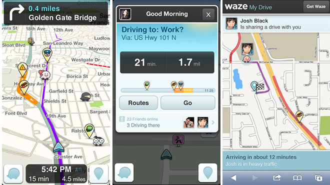 Waze เป็นแอพนำทางรูปแบบใหม่ ที่พัฒนาโดยโปรแกรมเมอร์ในอิสราเอล โดยจะเปิดให้ผู้ใช้ได้ร่วมกันแชร์สภาพการจราจร และนำเสนอเส้นทางลัดที่ตัวเองรู้ ให้กับผู้ใช้คนอื่น และจะได้คะแนนเป็นของตอบแทน ซึ่งที่ผ่านมาก็มีผู้ให้ความสนใจในแอพนี้มากรวมทั้ง Google, Facebook และ Apple