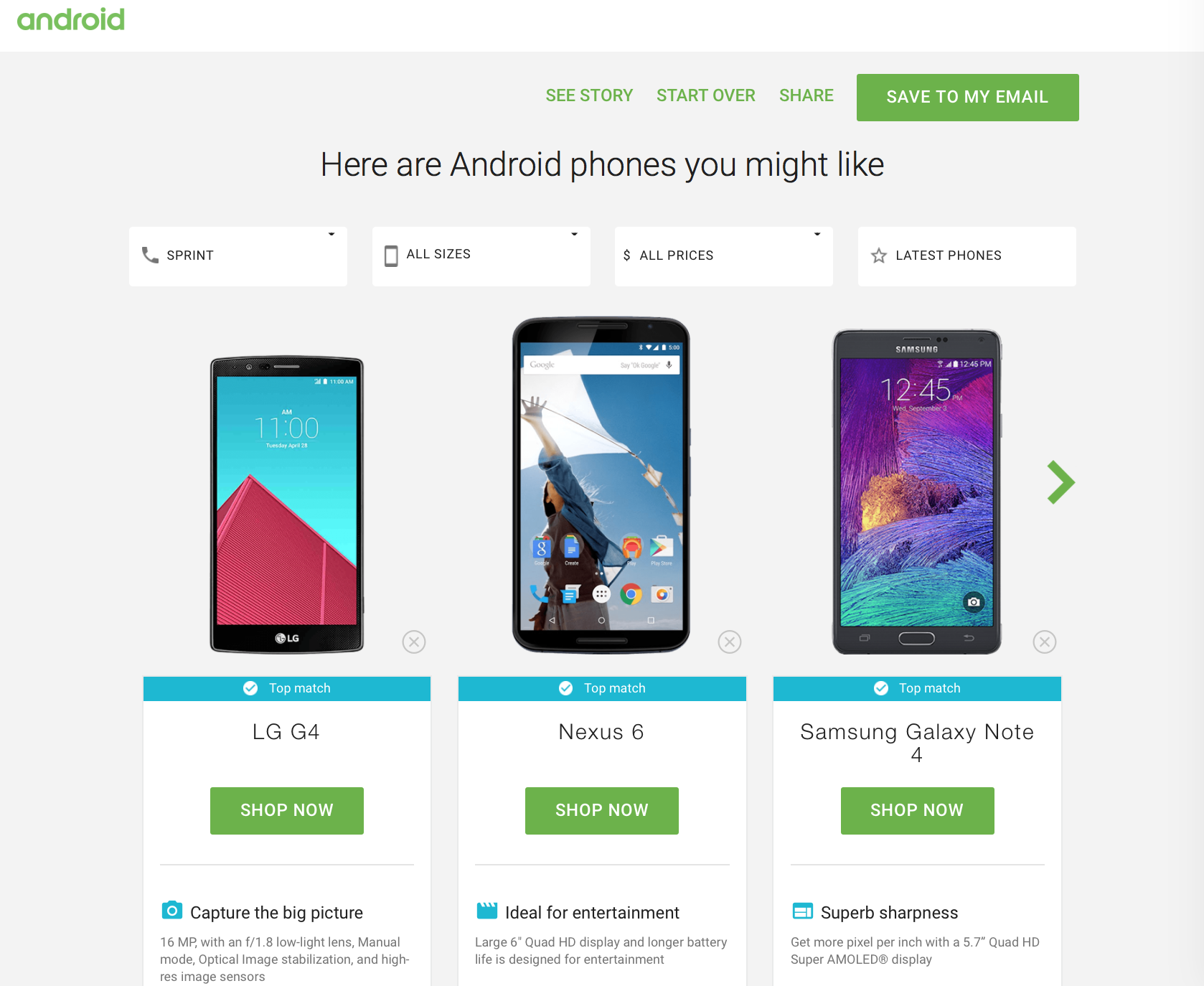 เพราะสมาร์ทโฟนระบบปฏิบัติการแอนดรอยด์นั้นมีให้เลือกมากมายหลายรุ่นในท้องตลาด การซื้อสมาร์ทโฟนแอนดรอยด์สักเครื่องจึงเป็นสิ่งที่ท้าทายผู้ใช้หลายคน เหตุผลนี้ทำให้ Google พัฒนาเครื่องมือใหม่เพื่อให้ชาวออนไลน์ได้ตอบคำถามเล็กน้อย ก่อนที่ระบบจะแนะนำสมาร์ทโฟนแอนดรอยด์ที่น่าสนใจตามข้อมูลที่ได้รับ
