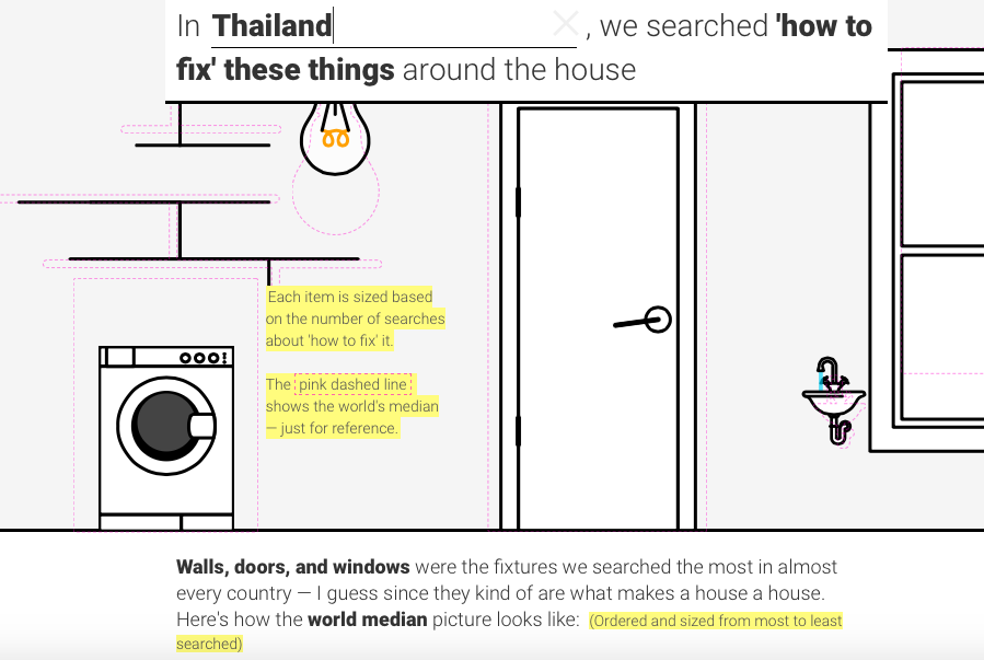 นอกจากจะเปิดเผยรายการค้นหา How to ยอดนิยม Google ยังเปิดตัวเว็บไซต์ชื่อ ‘How to fix a toilet‘ เพื่อให้รายละเอียดข้อมูลเทรนด์ตามประเทศของผู้เสิร์ช ซึ่งทำให้เข้าใจเทรนด์ความสนใจได้ดีขึ้น เช่น ประเทศไทย Google ระบุว่ามีการค้นหาวิธีซ่อมหลอดไฟมากเป็นอันดับ 9 น้อยกว่าการค้นหาวิธีซ่อมอ่างหรือซิงก์ที่อยู่อันดับ 5 แต่การซ่อมโถชักโครกนั้นไม่ค่อยได้รับความนิยม เพราะทำอันดับ 27