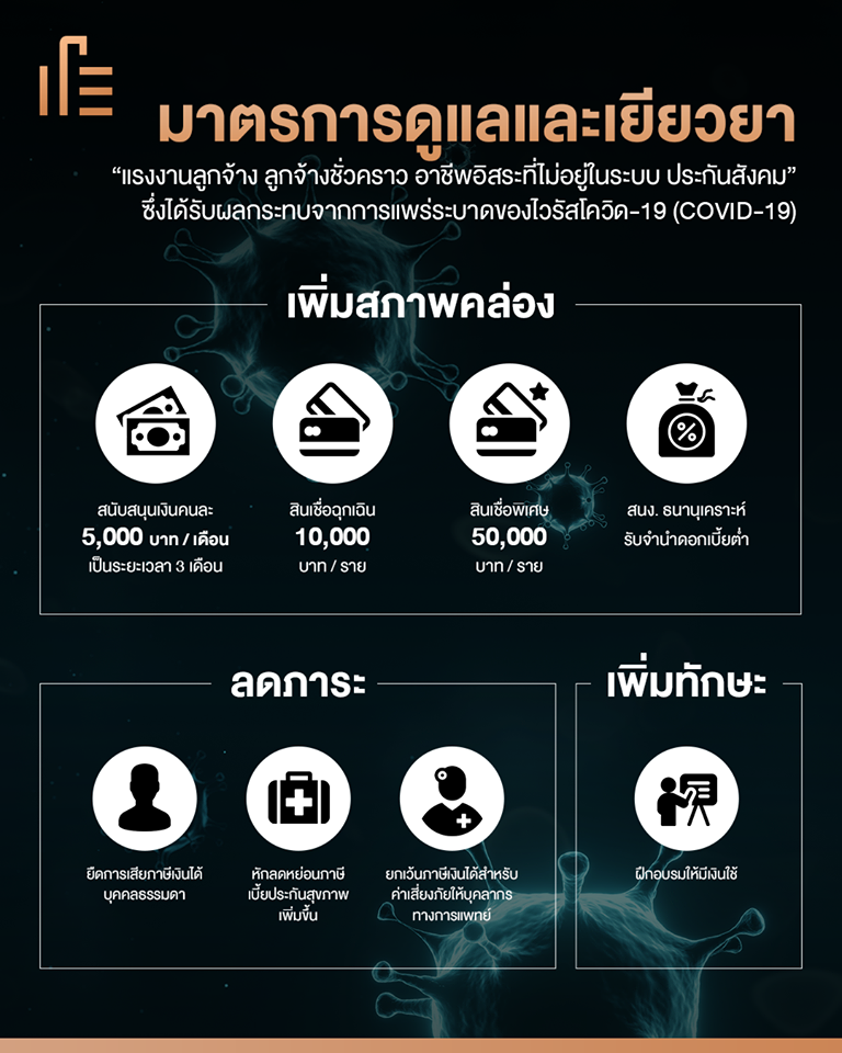 สรุปมาตรการดูแลและเยียวยา “แรงงานลูกจ้าง ลูกจ้างชั่วคราว อาชีพอิสระที่ไม่อยู่ในระบบ ประกันสังคม” ซึ่งได้รับผลกระทบจากการแพร่ระบาดของไวรัสโคโรนา (COVID-19)