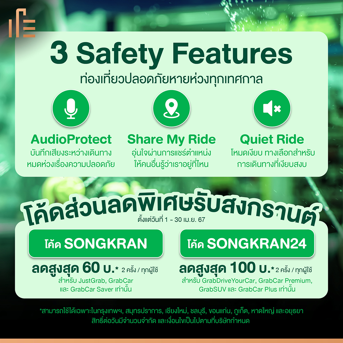 ยังไม่หมดเพียงเท่านั้น! เพราะเดือนนี้ Grab ยังมาพร้อมกับส่วนลดพิเศษรับสงกรานต์ ที่แจกให้ผู้ใช้เดินทางช่วงเทศกาลได้แบบจุใจ ตั้งแต่วันที่ 1 – 30 เม.ย. 67