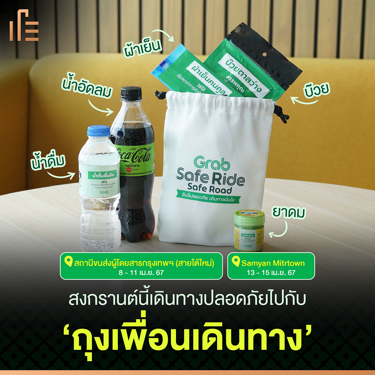 สงกรานต์ปีนี้ Grab ใจดีแจกของขวัญรับปีใหม่ไทยกับ ‘ถุงเพื่อนเดินทาง’ หรือชุด Safety Kit ไว้ตามจุดต่าง ๆ สำหรับคนที่เดินทางกลับบ้านช่วงสงกรานต์ โดยภายในถุงจะมีการจัดเซ็ตเตรียมพร้อมสำหรับการเดินทางที่เรียกว่าเหมาะกับหน้าร้อนสุด ๆ เพราะมีทั้ง น้ำดื่มชื่นจิต, น้ำอัดลม, ยาดมฟินสุดสูด, บ๊วยตาสว่าง และผ้าเย็นคนคูล เพื่อให้เดินทางปลอดภัย สดชื่นตาตื่นตลอดทริป!