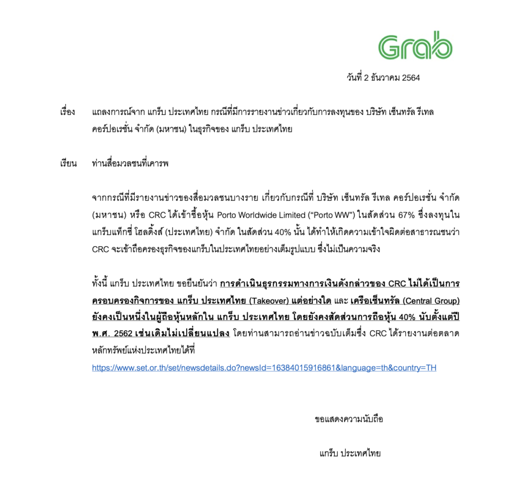เรื่อง แถลงการณ์จาก แกร็บ ประเทศไทย กรณีที่มีการรายงานข่าวเกี่ยวกับการลงทุนของ บริษัท เซ็นทรัล รีเทล คอร์ปอเรชั่น จำกัด (มหาชน) ในธุรกิจของ แกร็บ ประเทศไทย