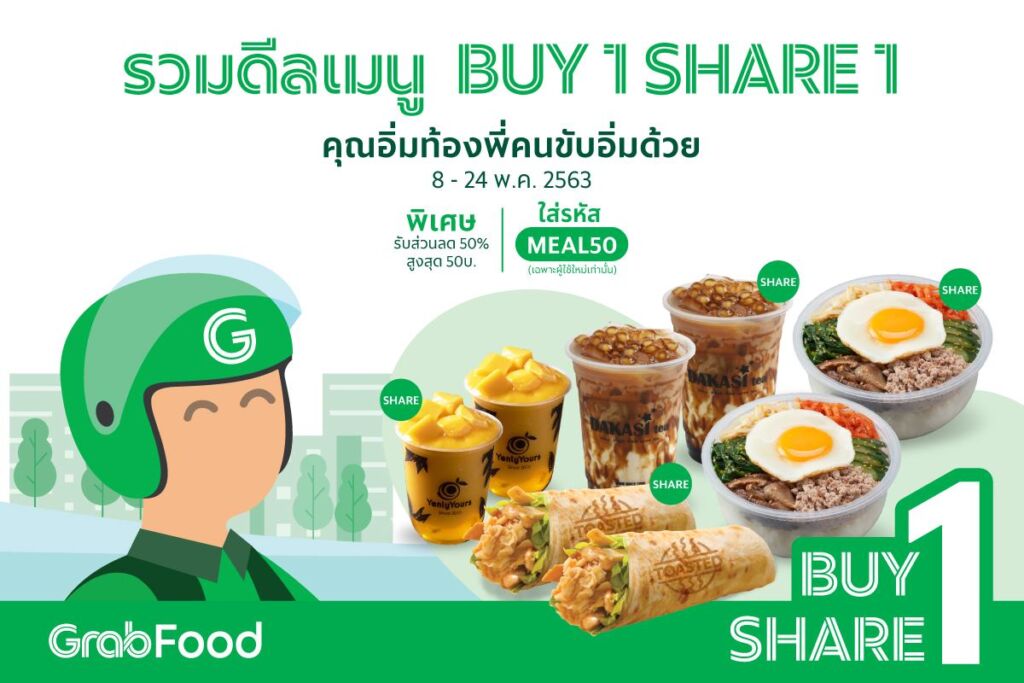 Grab ประเทศไทยชวนร่วมปันน้ำใจและสร้างรอยยิ้มให้แก่กัน โดยแคมเปญ Buy 1 Share 1 ผู้ใช้จะได้รับอาหาร 1 เมนู และแบ่งปันอีก 1 เมนู ให้กับคนขับ GrabFood ได้อิ่มท้อง เพื่อเป็นการขอบคุณ และเป็นกำลังใจให้ผ่านพ้นวิกฤตไปด้วยกัน