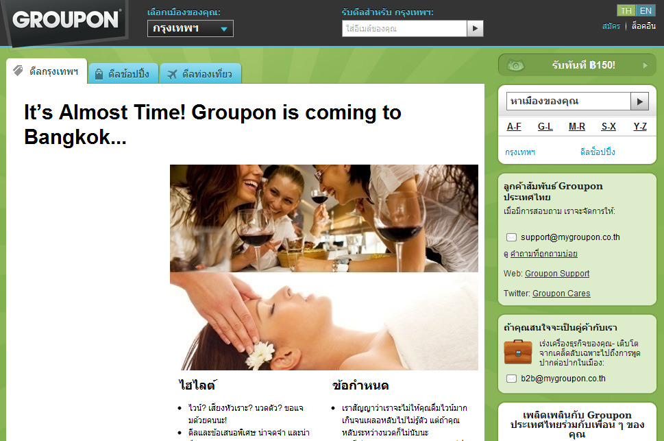 ในขณะที่เรากำลังรายงานอยู่นี้ Groupon ประเทศไทยยังคงไม่แสดงดีลที่ตัวเองหาออกมาแต่อย่างใด ได้แต่เปิดให้คนสมัครสมาชิกกันเข้ามา โดยใครที่ช่วยแนะนำ Groupon ในตอนนี้ก็จะได้รับ Reward credits คนละ 150 บาท เป็นกลยุทธ์ Friend get Friend นั่นเอง