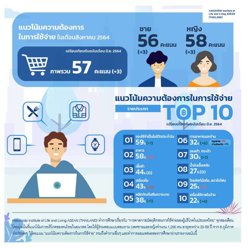 สถาบันวิจัยความเป็นอยู่ฮาคูโฮโด อาเซียน (ประเทศไทย) ร่วมกับ บริษัท โซซิอัส จำกัด เผยผลสำรวจการคาดการณ์พฤติกรรมผู้บริโภคไทยประจำเดือนสิงหาคม 2564 พบว่า คนไทยมีความสุขลดลง ซึ่งมีผลกระทบมาจากการแพร่ระบาดของโควิด-19 ในระลอกที่สี่ ในขณะเดียวกัน มีการใช้จ่ายที่เพิ่มขึ้นสวนทางกับสภาวะเศรษฐกิจที่ฝืดเคือง