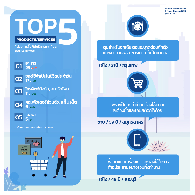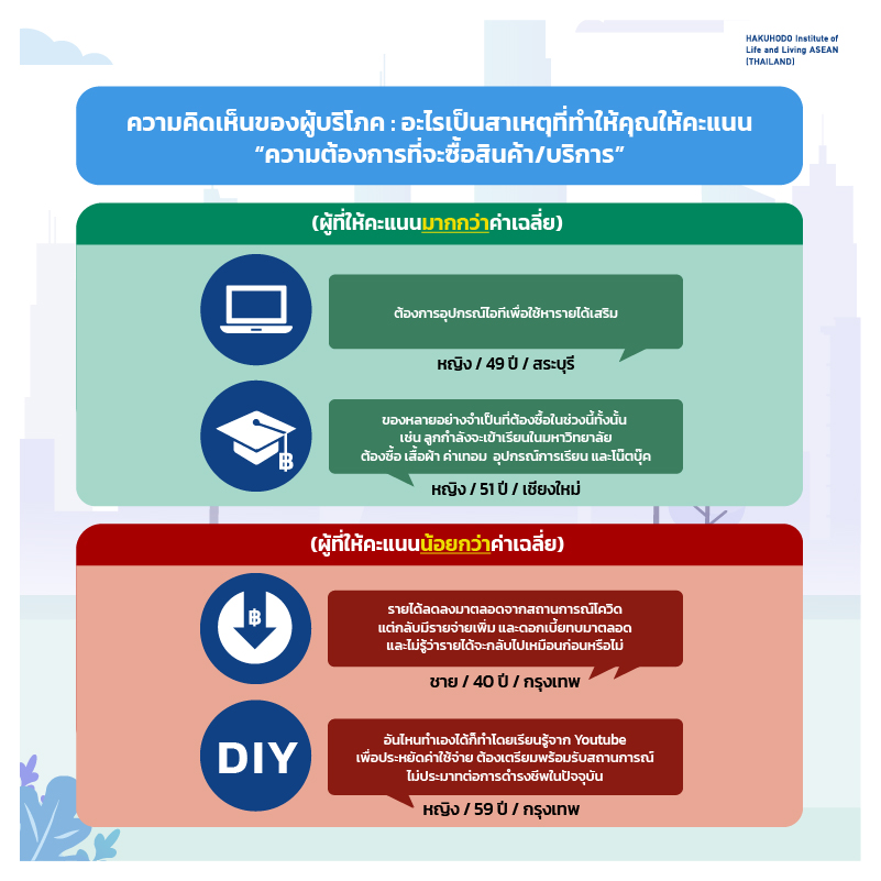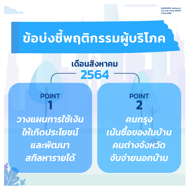 โดยส่วนใหญ่เน้นใช้จ่ายในสิ่งที่จำเป็น รวมไปถึงการกักตุนอาหารเพื่อการดำรงชีพของตนเองและครอบครัวภายในบ้าน และวางแผนใช้จ่ายในช่วงเทศกาลวันแม่ สร้างความสุขเล็กๆ น้อยๆ เพื่อลดความตึงเครียดจากข่าวสารเรื่องวัคซีนโควิด ซึ่งเป็นประเด็นข่าวอันดับต้นๆ ที่ผู้คนสนใจไม่น้อยไปกว่าข่าวการเมืองและสถานการณ์ความเป็นไปในสังคมที่เข้มข้น รวมถึงหาแนวทางในการปรับตัวและดำเนินชีวิตให้อยู่รอดในช่วงนี้