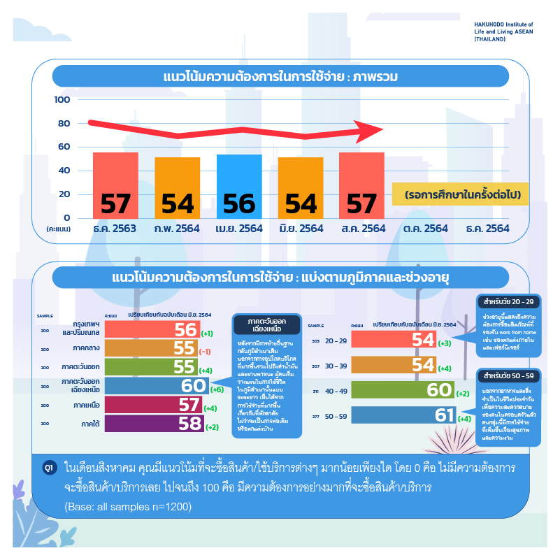 ผลสำรวจครั้งล่าสุดในเดือนสิงหาคมนี้ ทางสถาบันวิจัยฯ ได้ทำการสำรวจทางออนไลน์ “การคาดการณ์พฤติกรรมการใช้จ่ายของผู้บริโภคในประเทศไทย” ทุก 2 เดือน ร่วมกันระหว่างสถาบันวิจัยความเป็นอยู่ฮาคูโฮโด อาเซียน (ประเทศไทย) กับบริษัทในเครือ มุ่งเน้นที่คาดการณ์แนวโน้มการบริโภคของคนไทยในอนาคต โดยผู้ร่วมตอบแบบสอบถามประกอบไปด้วยเพศชายและเพศหญิงจำนวน 1,200 คน อายุระหว่าง 20-59 ปี จาก 6 ภูมิภาคทั่วประเทศ
