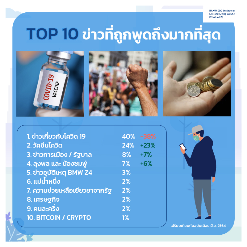จากแนวโน้ม “การคาดการณ์พฤติกรรมการใช้จ่ายของผู้บริโภคในประเทศไทยประจำเดือนสิงหาคม 2564” พบประเด็นที่น่าจับตาในบทวิเคราะห์นี้ คือประเด็นข่าวร้อนที่คนไทยติดตามและถูกพูดถึงมากที่สุด 3 อันดับ ได้แก่ อันดับที่ 1 ข่าวประเด็นสังคมที่เกี่ยวกับสถานการณ์โควิด-19 คิดเป็นร้อยละ 40 รองลงมาอันดับที่ 2 ข่าวที่รัฐบาลดำเนินการจัดสรรวัคซีนโควิด-19 ซึ่งเป็นความหวังของประชาชน ร้อยละ 24 เนื่องจากตัวเลขผู้ติดเชื้อยังคงสูงขึ้นต่อเนื่อง ประชาชนมีความแคลงใจในประสิทธิภาพของวัคซีน
