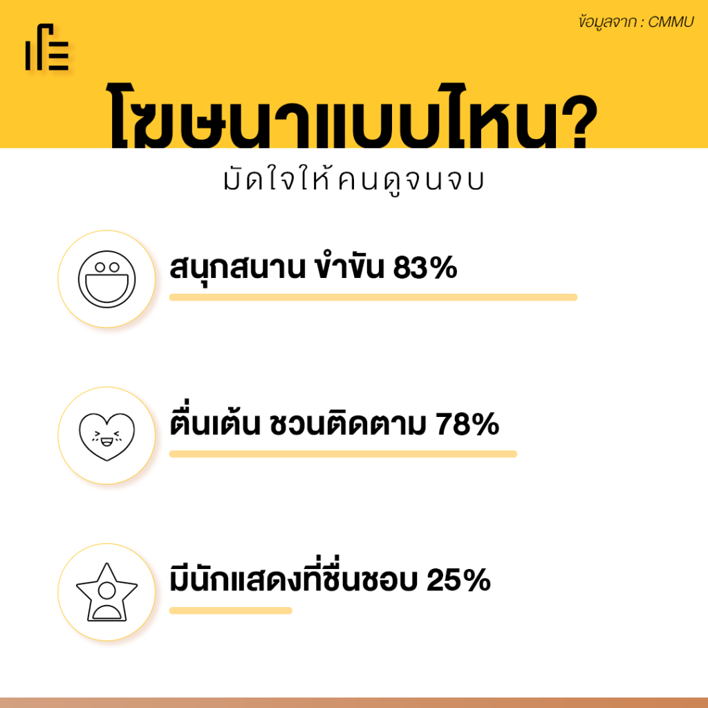 ซึ่งข้อมูลผลการวิจัยยังแสดงให้เห็นว่า โฆษณาที่จะสามารถมัดใจผู้บริโภคให้รับชมจนจบได้ต้องมีเนื้อหาสนุกสนานขำขันสูงถึง 83% ตามมาด้วยเนื้อหาตื่นเต้นชวนติดตาม 78% และการมีนักแสดงที่ชื่นชอบ 25% ตามลำดับ นอกจากนี้รูปแบบเนื้อหา 3 อันดับแรกที่สามารถดึงดูดผู้บริโภคได้มากที่สุด ได้แก่