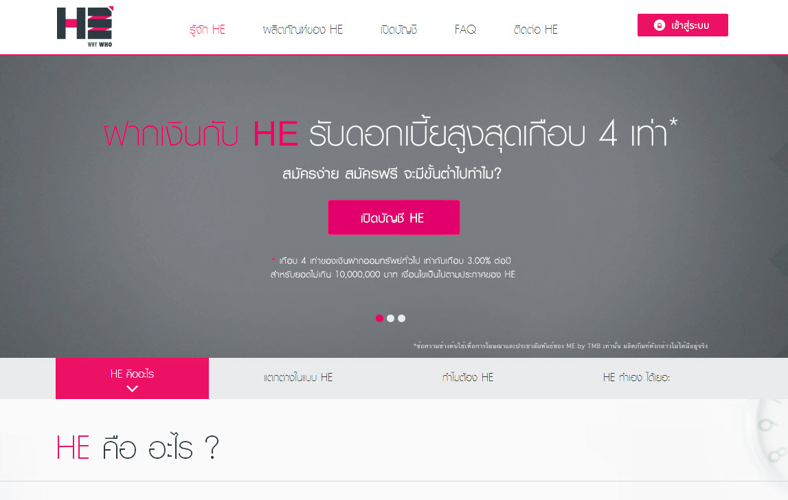 เรียกได้ว่าทำเอาคนบนโลกออนไลน์งงกันไปสักพักทีเดียวกับบริการ HE ที่เปิดตัวได้ดูทันสมัยและเรียกความสนใจให้คนนั่งดูแล้วฉงนเบาๆ ว่า HE คืออะไร ยิ่งเมื่อเข้าไปที่เว็บไซต์ HEWHYWHO.COM แล้วพบว่าเป็นบริการเงินฝากที่ให้ดอกเบี้ยเกือบสูงมากยิ่งงงกันเข้าไปใหญ่ วันนี้เราเจอคำตอบแล้ว ลองติดตามดูนะครับ