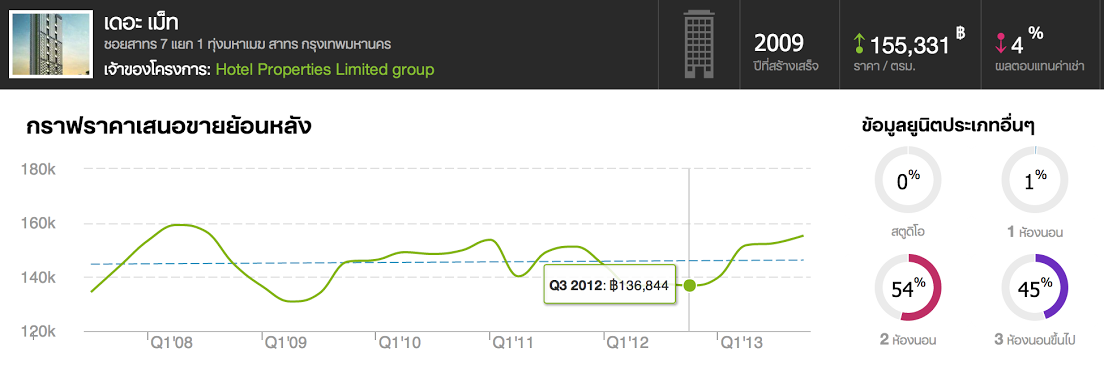 ผู้ใช้บริการของ HipFlat สะท้อนให้เห็นถึงแนวโน้มตลาดคอนโดมิเนียมของประเทศไทยในปัจจุบัน การสอบถามข้อมูลกว่า 90% มาจากคนไทย ส่วนที่เหลือมาจากชาวต่างชาติที่อาศัยอยู่ในประเทศไทย ราคาของคอนโดมิเนียมในทุกเขตของกรุงเทพฯ ผันแปรตั้งแต่ 200,000 บาท ถึง 84 ล้านบาท โดยเฉลี่ย 33% ของการสอบถามข้อมูลมาจากผู้ที่ต้องการเช่า และ 66% มาจากผู้ที่ต้องการซื้อ