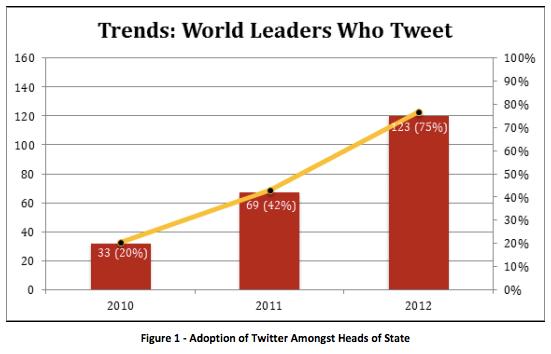 ล่าสุด Twitter กำลังเป็นเครื่องมือสื่อสารทางการเมืองอย่างจริงจัง เพราะการสำรวจพบว่าผู้นำรัฐบาลกว่า 75% ทั่วโลกล้วนลงชื่อใช้งานบน Twitter อย่างเป็นทางการ โดยการสำรวจขององค์กร Digital Policy Council (DPC) พบว่าในจำนวน 164 ประเทศ ผู้นำรัฐบาลกว่า 123 ประเทศในกลุ่มนี้ล้วนมีชื่อบัญชี Twitter เป็นของตัวเอง