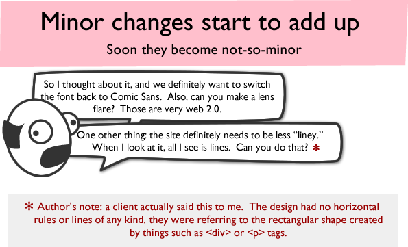แล้วจาก “นิโหน่ย” ก็เพิ่มเข้ามาให้มันดู “เยอะๆ” เข้าไว้ จากที่ว่าเปลี่ยน “นิโหน่ย” ตอนนี้มันชักไม่ “นิโหน่ย” แล้วล่ะ ลูกค้ากล่าวว่า “อืมม ผมไปคิดมาแล้วนะ ผมอยากจะกลับไปใช้ฟอนต์ Comic Sans เอ้อ แล้วคุณทำให้มันมีประกายปิ๊งๆ หน่อยได้ไหม มันจะดูเป็น Web 2.0 ขึ้นมาทันใดเลย และอีกอย่างนึงนะ เส้นมันเยอะไปหน่อย แก้หน่อยนะ นะ?” หมายเหตุผู้แต่งการ์ตูน: ลูกค้าพูดคำพวกนี้กับผมจริงๆ ดีไซน์มันไม่ได้มีอะไรเป็นเส้นไหนอย่างที่เขาว่าเลย พวกนี้มันเป็นเส้นขึ้นมาจากแท็กพวก <div> หรือ <p> ต่างหากเล่า