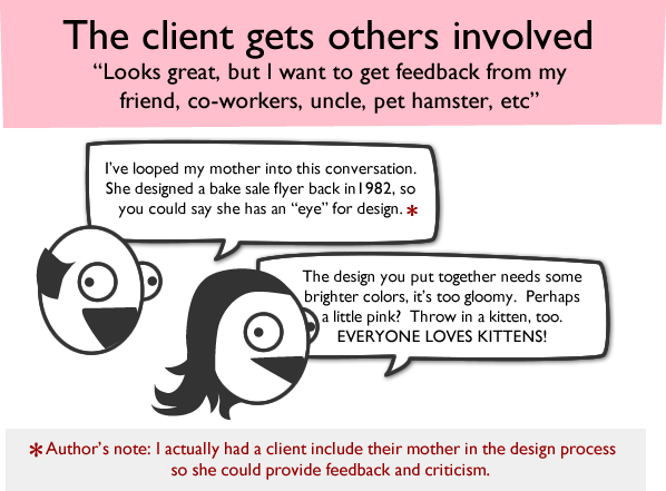 ลูกค้าเริ่มเอาคนอื่นมาดูด้วย: “เจ๋งเลย แต่ผมอยากได้ฟีดแบคจากเพื่อน เพื่อนร่วมงาน ฯลฯ… ผมขอเอาแม่ผมมาดูด้วยนะ เธอเคยออกแบบใบปลิวขนมอบเมื่อปี 2524 เธอออกแบบเก่งนะครับ” แม่ของลูกค้า: ดีไซน์โดยรวมต้องสว่างกว่านี้สักหน่อยนะ อันนี้มันดูทึมๆ ใส่สีชมพูเข้าไปซะหน่อยไหมคะ? ใส่ลูกแมวเข้าไปสักตัวสิ ใครๆ ก็รักแมว!” หมายเหตุจากผู้แต่งการ์ตูน: ผมเคยเจอลูกค้าเอาแม่มาดูขั้นตอนการออกแบบจริงๆ และเธอก็ออกความเห็นวิจารณ์ใหญ่เลย