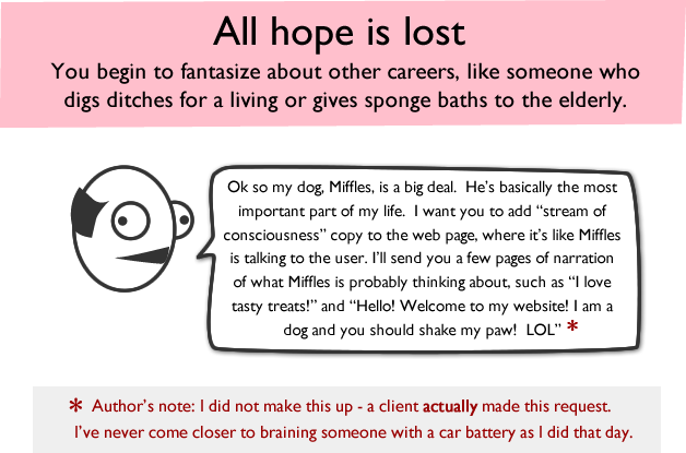 สิ้นหวัง: ตอนนี้คุณคงแทบอยากจะเปลี่ยนอาชีพไปล้างจานหรืออาบน้ำให้คนแก่ดีกว่า ลูกค้ากล่าวต่อไปว่า:? Ok อย่าลืมหมาผมด้วยสิ เจ้า Miffles ขาดขาใหญ่ไปได้ยังไง เขาเป็นส่วนสำคัญในชีวิตของผมเลยนะ ผมอยากให้คุณใส่คำว่า “กระแสแห่งการตระหนักรู้” เข้าไปด้วย มันจะทำให้เหมือนกับว่าเจ้า Miffles มันคุยกับคนที่เข้ามาในเว็บได้ ผมจะส่งให้คุณนะว่าจะบรรยายยังไง เช่น “ชั้นชอบอาหารอร่อยมื้อนี้สุดๆ!” และ “หวัดดี! ยินดีต้อนรับสู่เว็บไซต์ของฉันนะ! ฉันเป็นหมาและคุณก็ต้องจับอุ้งติงชั้นหน่อยเซ่! 555” หมายเหตุผู้แต่งการ์ตูน: ผมไม่ได้นั่งเทียนเขียนขึ้นมาเอง มีลูกค้าพูดอย่างนี้จริงๆ