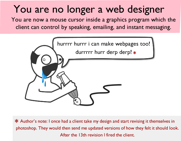 ลูกค้า: “เหอๆๆ ฉานสร้างเวบด้ายยยส์ ฉานสร้างเวบบบด้ายยยส์เห็นม๊ายยย เอื๊อกๆๆ” หมายเหตุผู้แต่งการ์ตูน: มีครั้งหนึ่งลูกค้าเอาดีไซน์ของผมไปทำใหม่ด้วยตัวเองด้วย Photoshop แล้วส่งอัพเดตมาให้ผม และหลังจากที่ลูกค้าสั่งแก้ครั้งที่ 13 ผมก็ลาขาด ไม่ทำงานให้ลูกค้าคนนั้นอีกแล้ว
