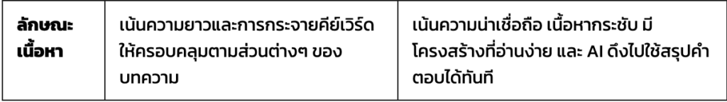 ดังนั้น คอนเทนต์ที่มีคีย์เวิร์ดเยอะอาจไม่ใช่คำตอบที่ดีที่สุดสำหรับการทำ AEO แต่คอนเทนต์ที่ตั้งคำถามที่ตอบผู้ใช้งานได้ตรงจุด จะมีโอกาสถูก AI เลือกมากกว่า