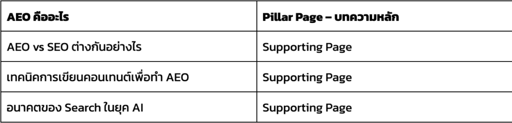 ต้องทำให้ AI มองว่าเว็บไซต์คุณเป็นแหล่งข้อมูลหลักในสายงานนั้น ต้องสร้างกลุ่มเนื้อหาที่เชื่อมโยงกันเป็นระบบ หรือที่เรียกว่า Topic Clusters เพื่อแสดงความเชี่ยวชาญเชิงลึกในภาพรวมของหัวข้อนั้น แทนที่จะมีแค่บทความเดียวเกี่ยวกับ AEO การจัดโครงสร้างแบบนี้ช่วยให้ AI เข้าใจว่าคุณไม่ได้พูดถึงเรื่องนี้แบบผิวเผิน แต่ครอบคลุมหลายมุมมองเกี่ยวกับ AEO เช่น