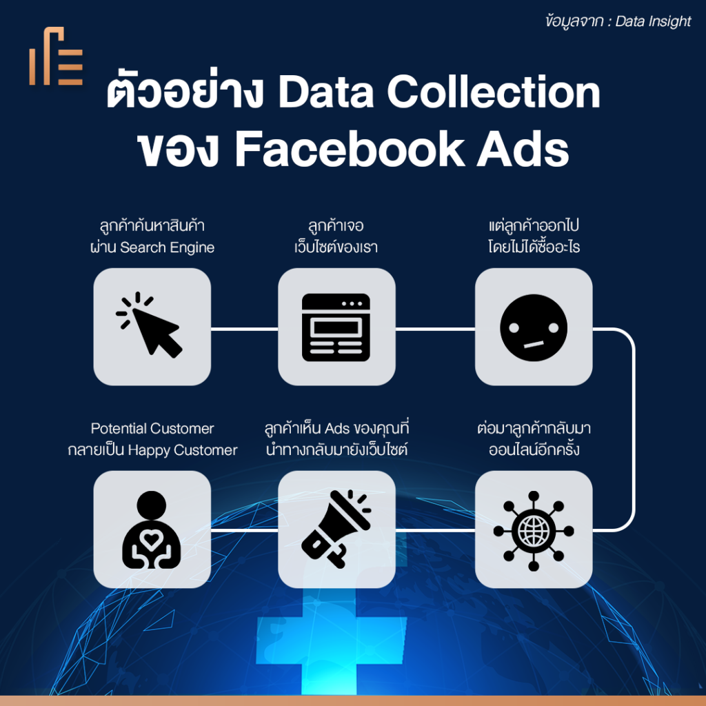 การทำ Data Collection ของ Facebook Ads ที่ดี คือต้องรู้ก่อนว่า Journey ว่าลูกค้าจะเป็นไปในทางไหน และกำหนดเงื่อนไขให้เป็นไปตามนั้น โดยเราต้องรู้ว่าลูกค้าจะค้นหาอะไร ถึงจะมาเจอเว็บไซต์ของเรา แม้ลูกค้าจะออกไปโดยไม่ได้ซื้อสินค้าของเรา แต่อย่างน้อยก็จะจดจำแบรนด์หรือเว็บไซต์ของเราได้ จากนั้น การทำ retargeting จะทำให้ลูกค้ากลับมาเห็นเว็บไซต์เราอีกครั้งและจะเป็นกลุ่มลูกค้าที่มีโอกาสซื้อมากขึ้น