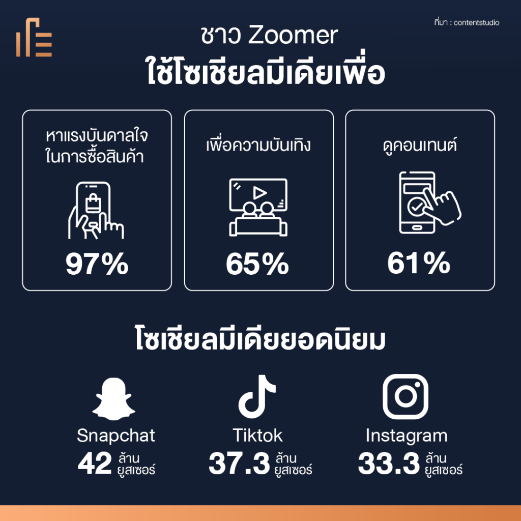 Gen Z หรือ Zoomers เป็นกลุ่มที่เกิดระหว่างปี 1997 – 2012 ที่ไม่เคยเห็นโลกที่ไม่มีอินเทอร์เน็ต คนที่มีอายุมากที่สุดในยุคนี้คือคนหนุ่มสาวอายุ 20 ต้นๆ ดังนั้น Zoomer หรือชาวเจน Z นับว่าเป็นกลุ่มคนที่มีการใช้โซเชียลมีเดียสูงและเป็นโอกาสของแบรนด์ในการสร้างความสัมพันธ์ที่ดีกับพวกเขาอย่างต่อเนื่อง