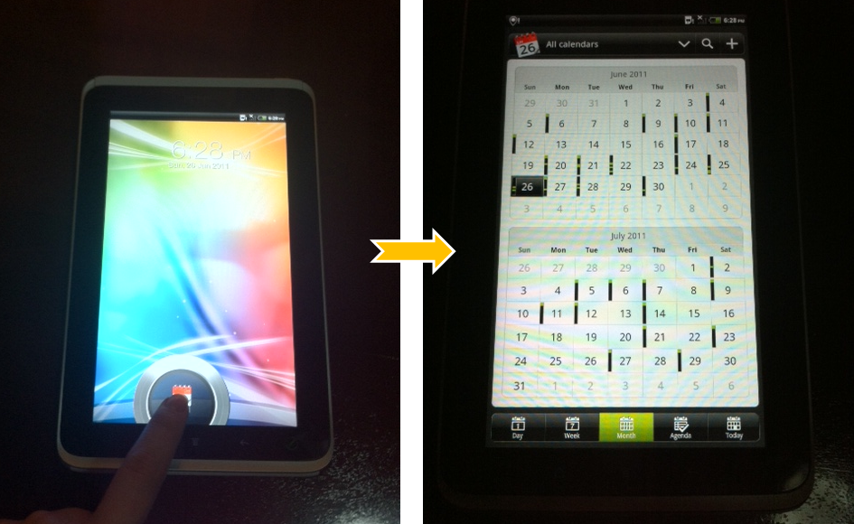 ที่เก๋และชอบคือเวลา Unlock Screen นั้น เราสามารถลากไอคอนของ App ที่ต้องการเปิดทันทีเข้าไปในรูปวงกลมด้านล่าง มันก็จะทำการเปิด app นั้นๆ ให้ทันที