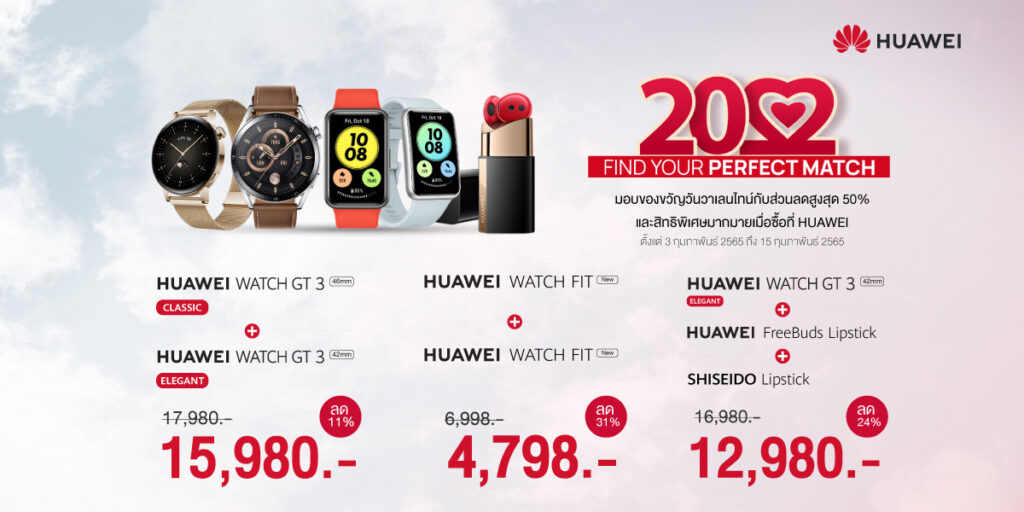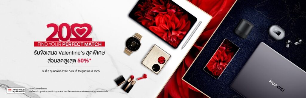 ไม่ว่าจะมองหาของขวัญเซอร์ไพรส์คนที่แอบชอบมานาน หรือหาของแทนความรักความห่วงใยให้คนข้างๆ รับรองว่าหัวเว่ยมี “Perfect Match” ในราคาที่คุ้มค่ารออยู่ที่เว็บไซต์ HUAWEI Store และแอปพลิเคชัน My HUAWEI ช้อปเลยตั้งแต่วันที่ 3 กุมภาพันธ์ 2565 ถึง 15 กุมภาพันธ์ 2565