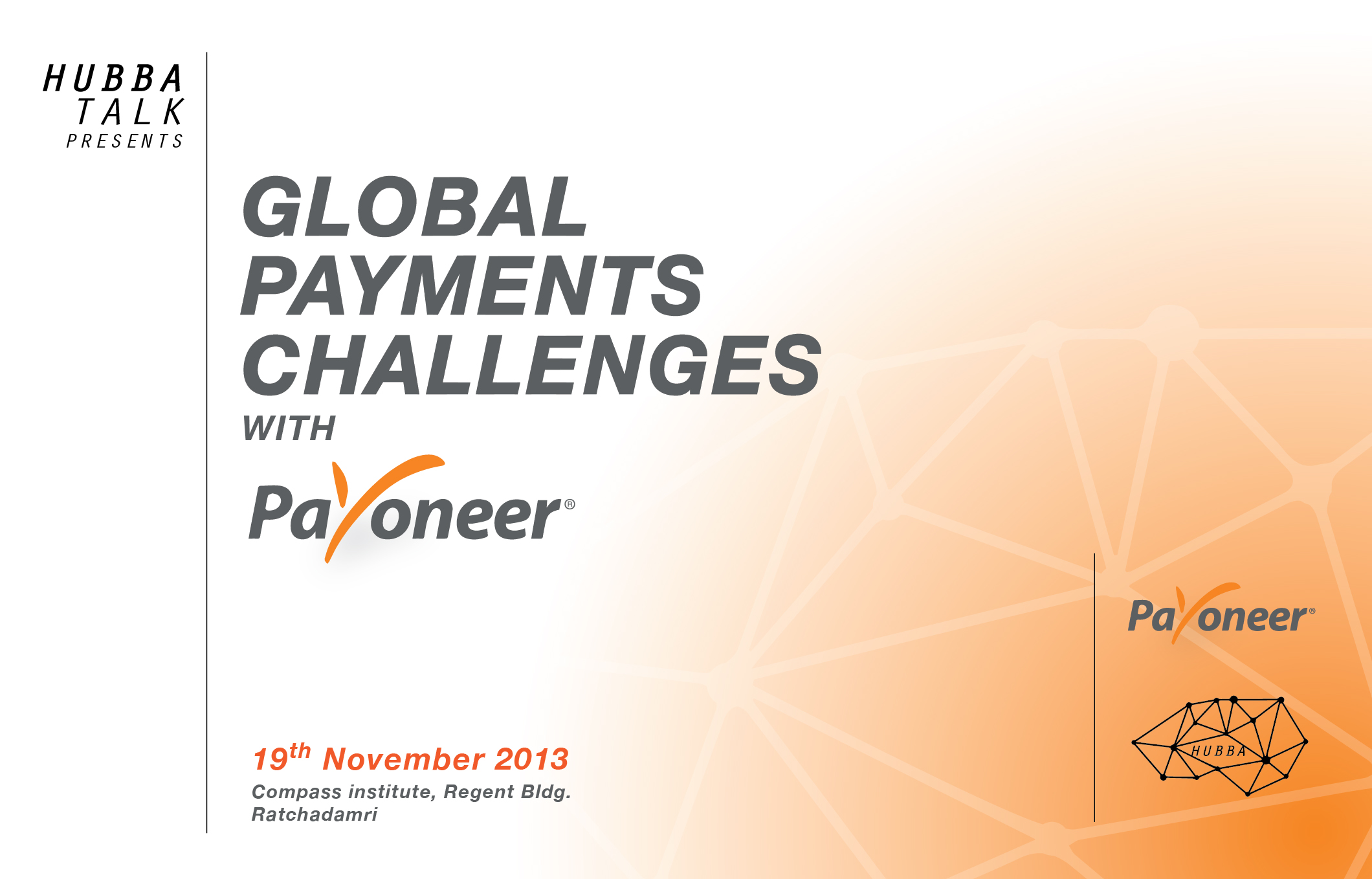 วันอังคารที่ 19 พฤศจิกายนนี้ co-working space ที่หลายคนรู้จักกันดีอย่าง HUBBA ขอเชิญคุณร่วมงาน HUBBA Talk ซึ่งคราวนี้จะมีแขกรับเชิญจากต่างประเทศ Oded Zehavi จาก Payoneer มาแชร์ประสบการณ์เรื่อง Global Payment Challenges ใครที่ทำงานด้าน Online Payment น่ามาฟังนะครับ ใครสนใจรายละเอียดลองอ่านด้านล่างนี้ได้เลย เห็นว่ารับแค่ 80 ที่เท่านั้น