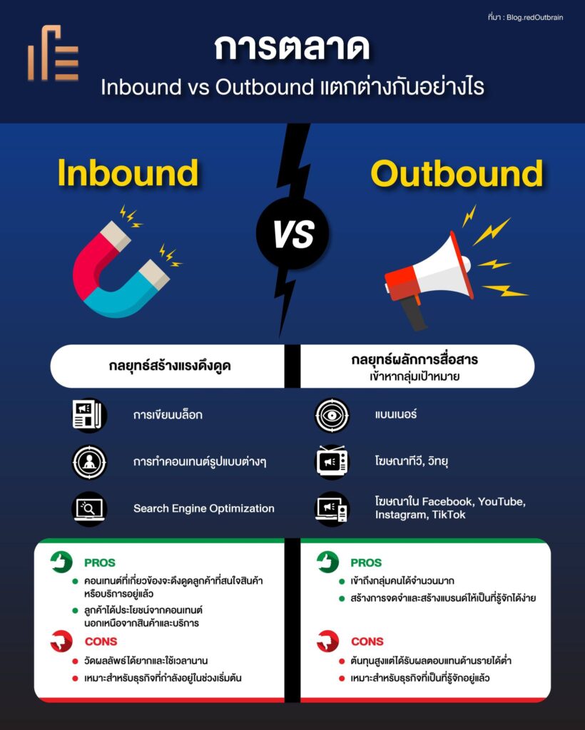 ซึ่งทั้งสองรูปแบบมีข้อดี-ข้อเสียแตกต่างกัน Inbound Marketing เป็นข้อดีที่ธุรกิจจะดึงดูดลูกค้าเข้ามาเอง แต่ก็ใช้ระยะเวลานาน ขณะเดียวกัน Outbound Marketing เหมาะสำหรับการกระตุ้นในระยะสั้น สามารถสื่อสารสิ่งที่ต้องการโปรโมทได้ทันที แต่ก็ไม่ยั่งยืน ใช้ได้เป็นครั้งคราว