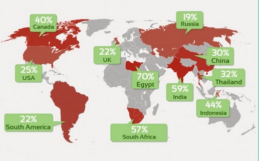 เฉพาะในประเทศอียิปต์ที่พบว่ามีการใช้งานอินเทอร์เน็ตบนมือถือเพิ่มสูงถึง 70% รวมไปถึงอินเดีย (59%) แอฟริกาใต้ (57%) อินโดนีเซีย (44%) แคนาดา (40%) และประเทศไทยของเรา (32%)
