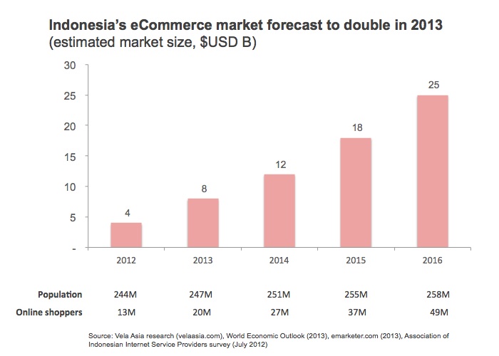 Vela Asia บริษัทวิเคราะห์การตลาดได้ทำการรวบรวมเอาข้อมูลจากแหล่งต่างๆ เพื่อทำการวิเคราะห์อัตราการเติบโตของตลาด e-commerce ในอินโดนีเซีย หลังจากทำการศึกษาข้อมูลรอบด้าน ทำให้พบว่าตลาดในอินโดนีเซียมีมูลค่าราว 8,000 ล้านเหรียญสหรัฐฯ ภายในปี 2013 นี้ ซึ่งเพิ่มขึ้นจากปี 2012 ถึง 2 เท่าทีเดียว