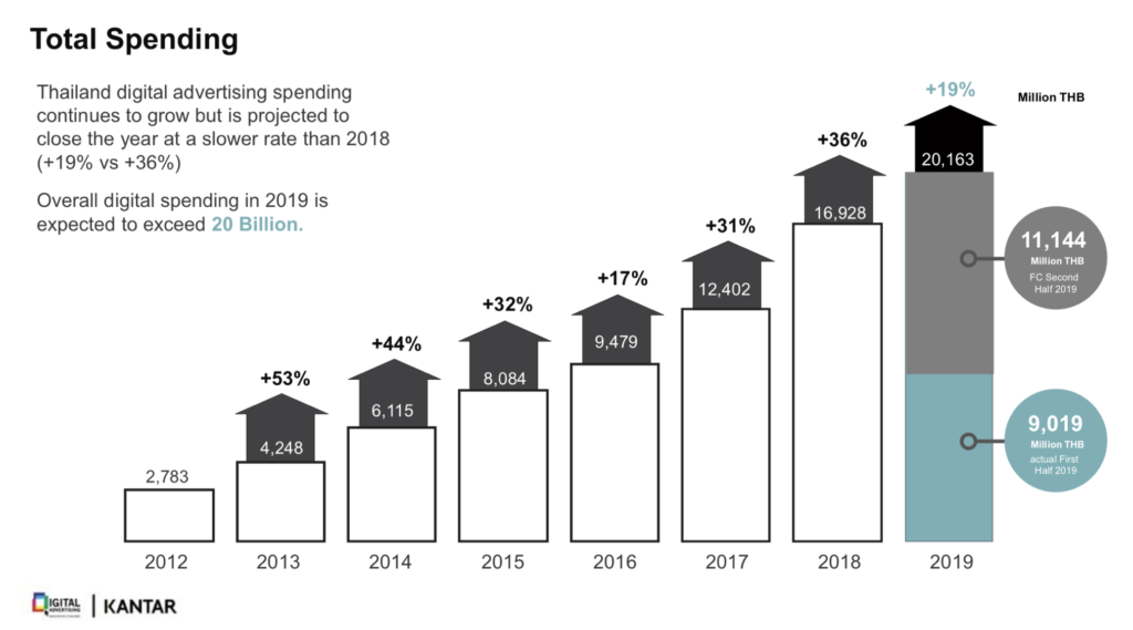 จากภาพจะเห็นได้ว่า ภาพรวมการใช้จ่ายงานโฆษณายังคงมีการเติบโตขึ้นต่อเนื่อง แม้มูลค่าเม็ดเงินจะมีสัดส่วนน้อยกว่าปี 2018 ก็ตาม แต่โดยรวมยังมีมูลค่าแตะ 20,163 ล้านบาท และ Facebook ยังคงเป็นคอนเทนต์ที่มีการใช้จ่ายสูงถึง 4,084 ล้านบาท แต่ตัวเลขนี้ยังไม่รวมการจ้างงาน Influencer ที่ไม่ได้มีการลงรายละเอียดด้านเม็ดเงินการจ้างงานที่ชัดเจน เพราะรูปแบบการจ้างงานยังมีความหลากหลาย