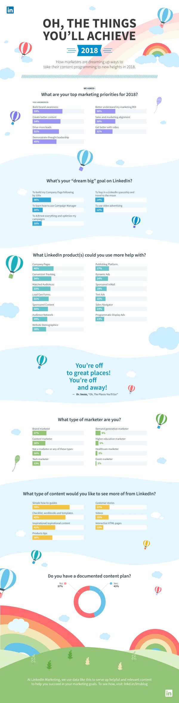 เพื่อให้ได้ข้อมูลมุมมองนักการตลาดที่มีต่อ LinkedIn ต้นสังกัด LinkedIn จึงสำรวจเพื่อถามว่านักการตลาดมีเป้าหมายและสิ่งที่ต้องการเรียนรู้เพิ่มเติมเกี่ยวกับ LinkedIn ในปีถัดไป ผลการสำรวจทั้งหมดถูกจัดเรียงลงใน Infographic นี้ ซึ่งแสดงให้เห็นถึงความท้าทายและแรงบันดาลใจของอุตสาหกรรมการตลาดแบบชัดเจน