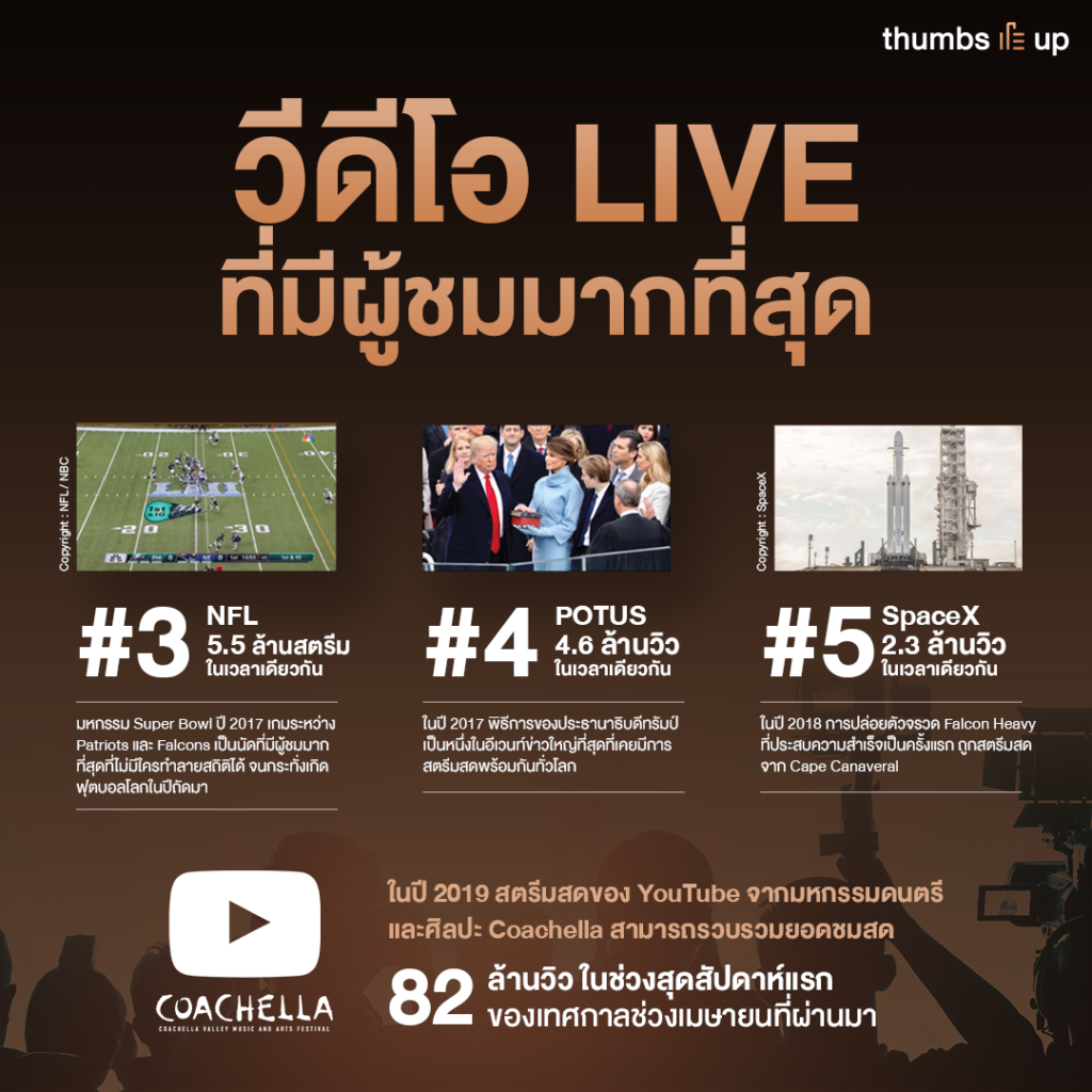 ในปี 2019 สตรีมสดของ YouTube จากมหกรรมดนตรีและศิลปะ Coachella สามารถรวบรวมยอดชมสด 82 ล้านวิวในช่วงสุดสัปดาห์แรกของเทศกาลช่วงเมษายนที่ผ่านมา