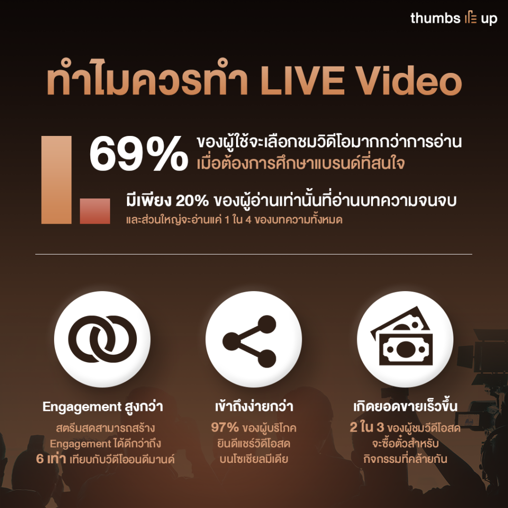 ทีมงาน Switcher Studio ผู้ให้บริการซอฟต์แวร์เพิ่มเอฟเฟ็กต์ในวิดีโอ Live สด รวบรวมสถิติน่าสนใจมาตกผลึกเป็น “วิธีใช้ Live Video เพื่อสร้างธุรกิจ” โดยบอกว่า 8 ใน 10 คนอยากดูวิดีโอสดมากกว่าอ่านโพสต์บล็อกหรือโซเชียลมีเดีย