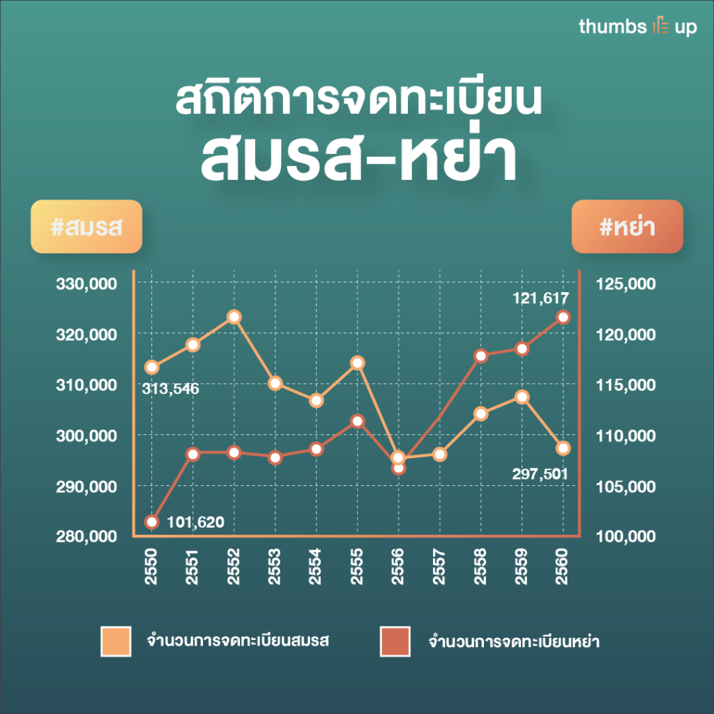 แม้ในช่วงปี 2550 ถึง 2560 ประเทศไทยจะมีประชากรเพิ่มขึ้นมากถึง 3 ล้านคน แต่ในปี 2550 สถิติการสมรสของคนไทยลดลงจากประมาณ 314,000 คู่ ส่วนในปี 2560 ลดมาอยู่ที่ประมาณ 298,000 คู่ (ลดลง 5.1%)