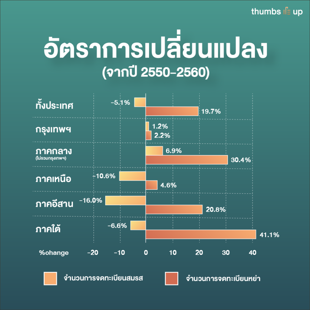 จากสถิติพบว่าการหย่าร้างมีอัตราที่สูงขึ้นอย่างมากในทุกภูมิภาค โดยเฉพาะภาคกลางและภาคใต้ ในขณะที่การจดทะเบียนสมรสก็มีอัตราที่ลดลงมากพอสมควรเช่นเดียวกัน