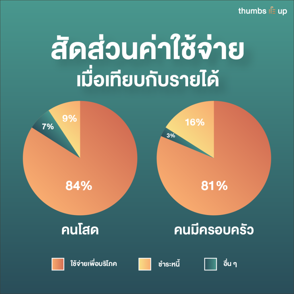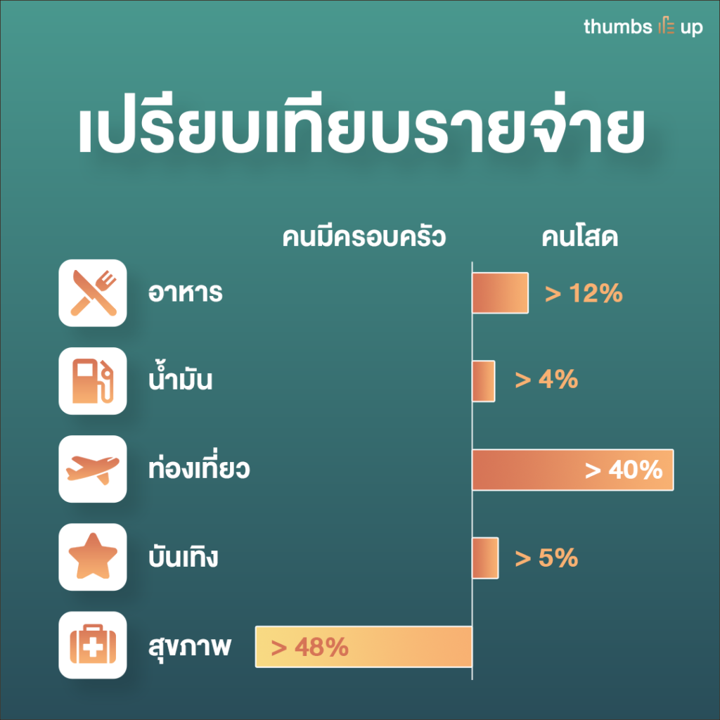 เมื่อเทียบกับรายได้แล้ว สัดส่วนค่าใช้จ่ายของคนโสดจะใช้จ่ายในการบริโภคมากถึง 84% ในขณะที่คนมีครอบครัวจะใช้จ่ายในการบริโภคอยู่ที่ 81%