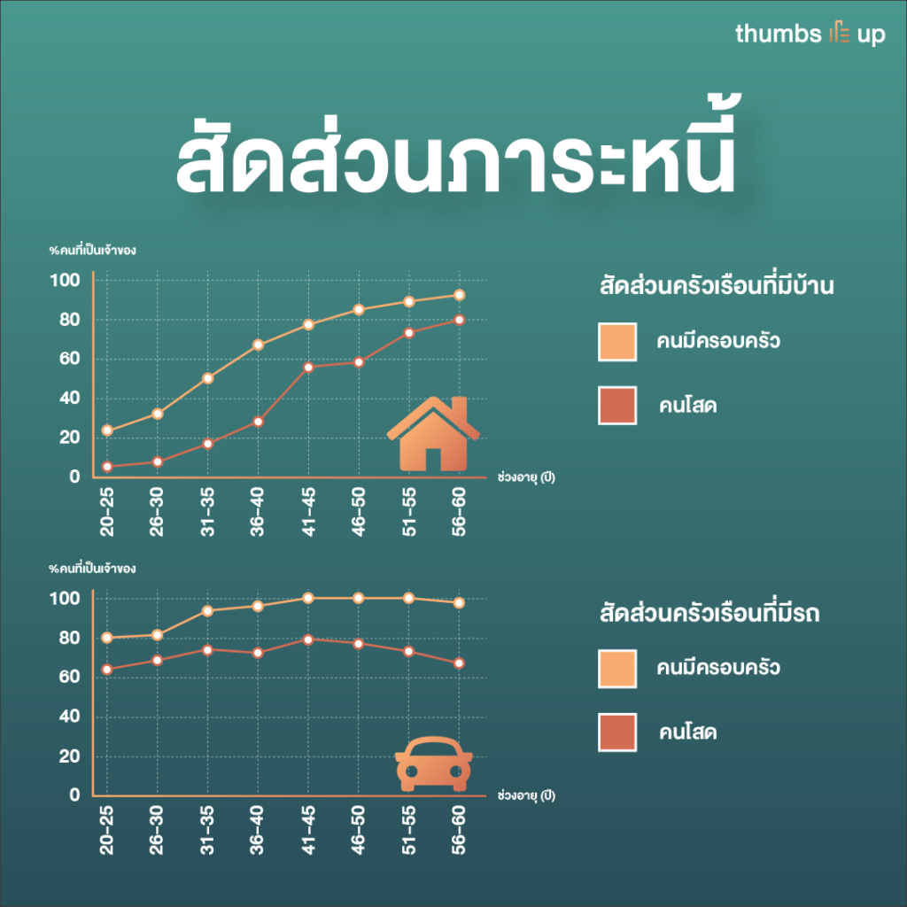 สังเกตได้ว่าสัดส่วนคนที่เป็นเจ้าของบ้านและรถส่วนมากจะเป็นคนมีครอบครัว โดยที่คนโสดจะมีเปอร์เซนต์การครอบครองบ้านและรถน้อยกว่าคนที่มีครอบครัวในทุกช่วงอายุ แสดงให้เห็นว่าคนโสดมีหนี้สินน้อยกว่า และใช้จ่ายเพื่อบริโภคมากกว่าคนที่มีครอบครัว