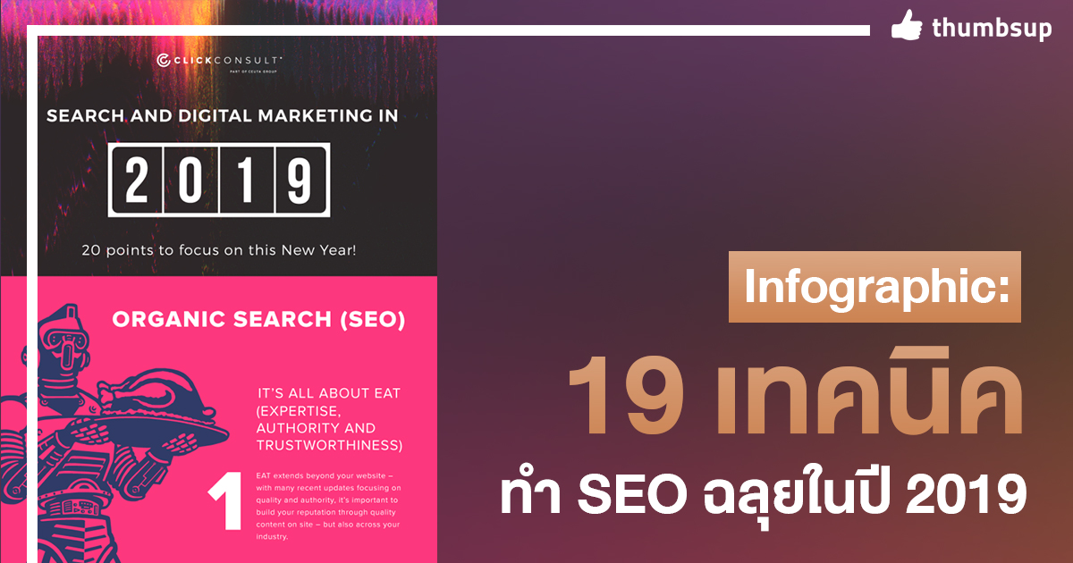 หนทางทำการตลาดดิจิทัลและการทำ SEO หรือ Search engine optimization นั้นเปลี่ยนแปลงไปทุกปี สำหรับปี 2019 วิธีการเพิ่มประสิทธิภาพ SEO ของทุกคนจะไม่ได้อยู่ที่การตั้งคีย์เวิร์ด หรือการเพิ่มลูกเล่นให้เว็บเพจเท่านั้น แต่อยู่ที่การปรับแนวทางเนื้อหาและแคมเปญโซเชียลซึ่งจะสร้างความเชื่อมั่นได้ดีขึ้นแบบก้าวกระโดด