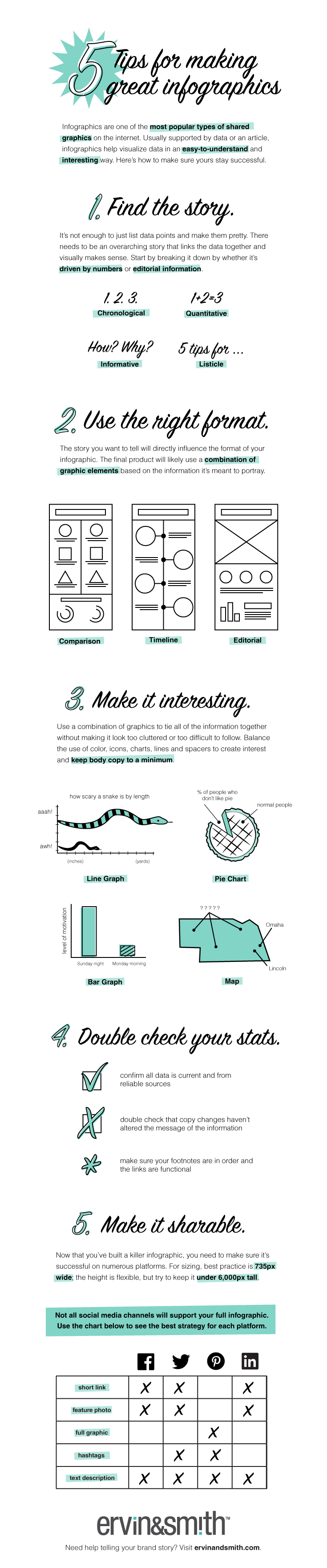 อีกจุดที่น่าสนใจคือขนาดของ infographic ที่แนะนำคือกว้าง 735 พิกเซล บนความยาวไม่เกิน 6,000 พิกเซล ยังมีคำแนะนำเพื่อให้ infographic สามารถปรับแต่งเพื่อแชร์บน social media อย่าง Facebook, Twitter, Pinterest และ LinkedIn ผู้สนใจสามารถติดตามต้นฉบับได้จากด้านล่าง