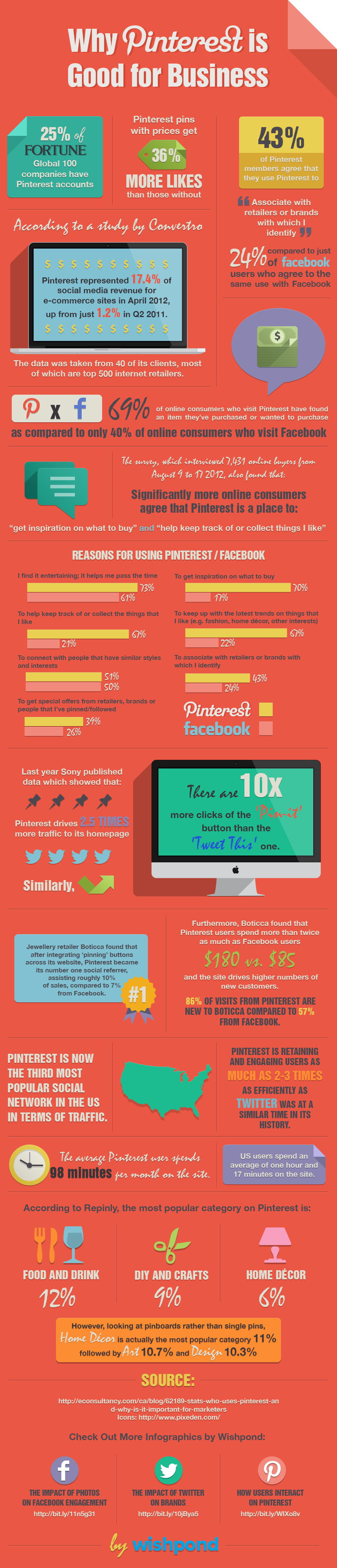 สาเหตุสำคัญที่ทำให้ธุรกิจจำนวนมากหันมาให้ความสนใจกับการใช้งาน Pinterest เพิ่มมากขึ้นเชื่อว่าอาจเป็นผลมาจาก การสำรวจที่พบว่าในปี 2012 ที่ผ่านมา Pinterest เป็นช่องทางที่ทำรายได้ในการซื้อขายสินค้าผ่านออนไลน์ (E-Commerce) คิดเป็นสัดส่วนอยู่ที่ 17.4% ของมูลค่าการทำธุรกิจบนโซเชียลมีเดียทั้งหมด ซึ่งเพิ่มขึ้นจากเดิมในช่วงไตรมาสที่ 2 ของปี 2011 ที่มีสัดส่วนเพียงแค่ 1.2% เท่านั้น รวมถึงในปีที่แล้วยังมีการระบุจากบริษัทโซนี่ว่า Pinterest ช่วยเพิ่ม Traffic บนเว็บไซต์ได้มากกว่าปกติถึง 2.5 เท่า