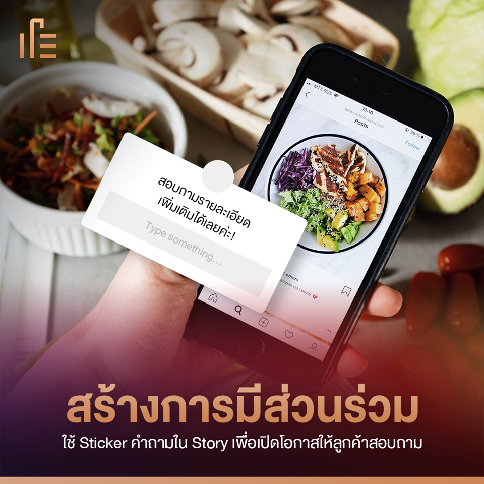 การมีส่วนร่วมจะทำให้ลูกค้ามีความสัมพันธ์กับแบรนด์มากยิ่งขึ้น ยกตัวอย่างเช่น การใช้ Sticker คำถามใน Story เพื่อเปิดโอกาสให้ลูกค้าสอบถามเกี่ยวกับสินค้า การใช้วิธีนี้จะทำให้คนรู้จักสินค้าและรู้สึกมั่นใจในการซื้อสินค้า