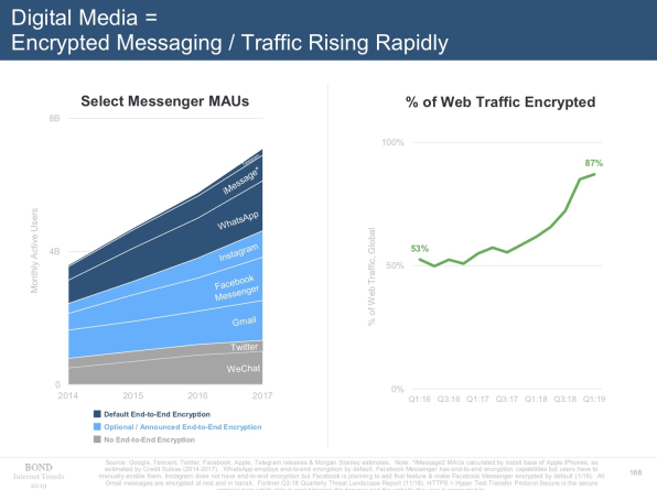 หนึ่งในกราฟภายในรายงานของ Mary Meeker แห่ง Bond Capital ระบุว่าสื่อดิจิทัลวันนี้มีพัฒนาการสำคัญซึ่งเชื่อว่าจะเกิดขึ้นชัดเจนต่อเนื่องไปอีกในอนาคต ทั้งการรับส่งข้อความที่ถูกเข้ารหัส และทราฟฟิกการใช้งานที่เพิ่มขึ้นก้าวกระโดด ทั้งหมดนี้ส่งให้แอปกลุ่ม messaging กลายเป็นโหมดสื่อสารของชาวโลกมากขึ้น ซึ่งแม้จะไม่มีพัฒนาการแบบปฏิวัติพลิกฝ่ามือ แต่ก็ชัดเจนว่าการเข้ารหัสกำลังจะกลายเป็นเรื่องปกติในวงการสื่อโซเชียล