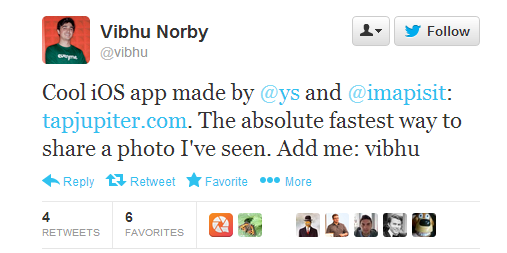 ทำไปเรื่อยๆ ปรับไปหลายเวอร์ชั่น มีไอเดียใหม่ๆ กันมาตลอด lose focus ไปบ้าง ทำไปเรื่อยๆ จนมาจบสุดท้ายที่การส่งรูปอย่างเดียว จุดขายของแอพฯ นั้นคือจะลดขั้นตอนก่อนการส่งรูปให้เหลือสั้นที่สุดนั่นคือ เลือก คนที่จะส่งให้กดถ่ายแล้วแอพฯ ก็จะส่งรูปให้เลยแอพฯ  เน้น Gesture เป็นหลักครับ  ผมขอเล่าประสบการณ์ระหว่างการทำ Jupiter นะครับ ซึ่งคิดว่าน่าจะเป็นประโยชน์ ผมและเพื่อน ไมได้นั่งทำงานอยู่ด้วยกัน อยู่คนละซีกโลกเหมือนกัน เพื่อนผมอยู่ Ireland ผมอยู่  San Francisco เราคุยกันผ่าน Google Talk ( เป็นhangout แล้ว ) แล้วก็ อีเมลงานกันไปมา และเราก็ใช้ Jupiter ในระหว่างการพัฒนาด้วยครับ  เลือกใช้ระบบจัดการงานอย่าง Trello ซึ่งฟรี แล้วก็แชร์ไฟล์กันผ่าน Dropbox ครับ