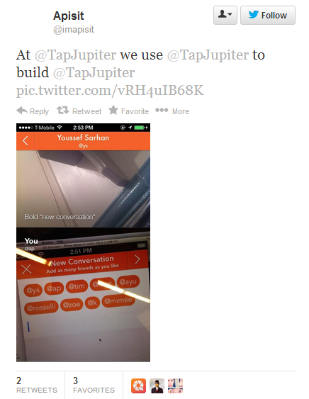 ผมและ Youssef (@ys) เจอกันบน Twitter ด้วยความที่ช่วงนั้นผมค่อนข้างเบื่อๆ ไม่มีอะไรทำ เจอคนนี้เค้าบอกว่ามีไอเดียทำอะไรสั้นๆ ก็เลย tweet ไปหาเค้า ก็เป็นจุดเริ่มต้นที่ได้มาทำงานด้วยกัน จาก tweet นั้นจนถึงวันนี้ ก็ประมาณ 1 ปีนิดๆ ครับ Jupiter จุดเริ่มต้นของไอเดียการทำ Jupiter นั้นเน้นตัวเองเป็น Messaging app ที่เน้น UX/UI ที่ง่ายและจะไม่มี Speech bubble  ครับ
