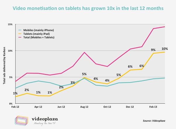 การสำรวจพบว่าทราฟฟิกการใช้ iPad คิดเป็นสัดส่วน 10% ของทราฟฟิกทั้งหมดที่เกิดขึ้นบนแพลตฟอร์มโฆษณาวิดีโอของ Karbon ซึ่งถือว่าเพิ่มขึ้นจากเมื่อ 12 เดือนที่แล้วกว่า 10 เท่าตัว นอกจากนี้จากการศึกษาพบว่า ทราฟฟิกการชมโฆษณาบนอุปกรณ์ที่ไม่ใช่เครื่อง PC คิดเป็นสัดส่วน 30% ของโฆษณาที่ถูกส่งไป ซึ่งก็เท่ากับว่า iPad ยึดครองส่วนแบ่งถึง 1 ใน 3 ของการสื่อสารข้อมูลจากอุปกรณ์ที่ไม่ใช่ PC