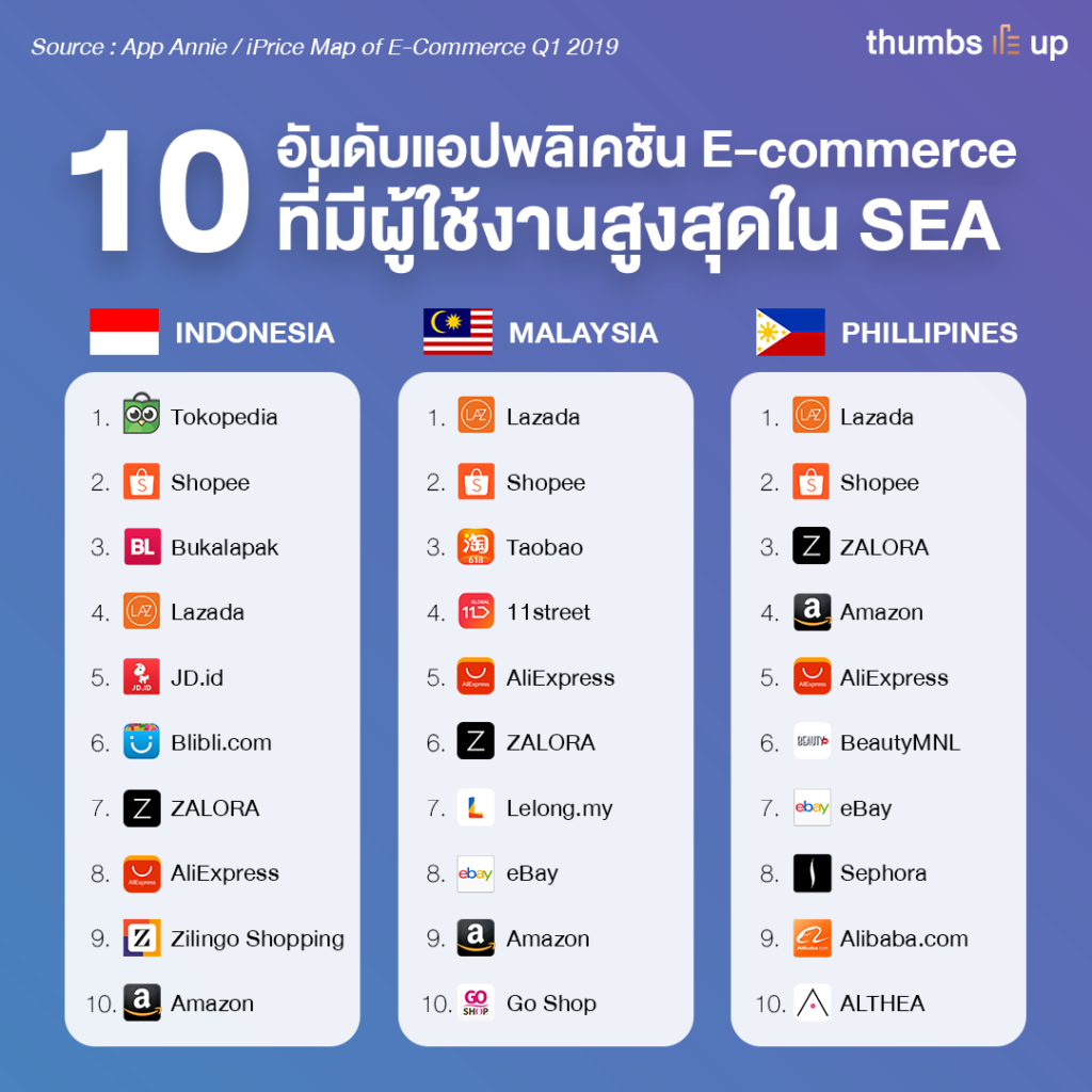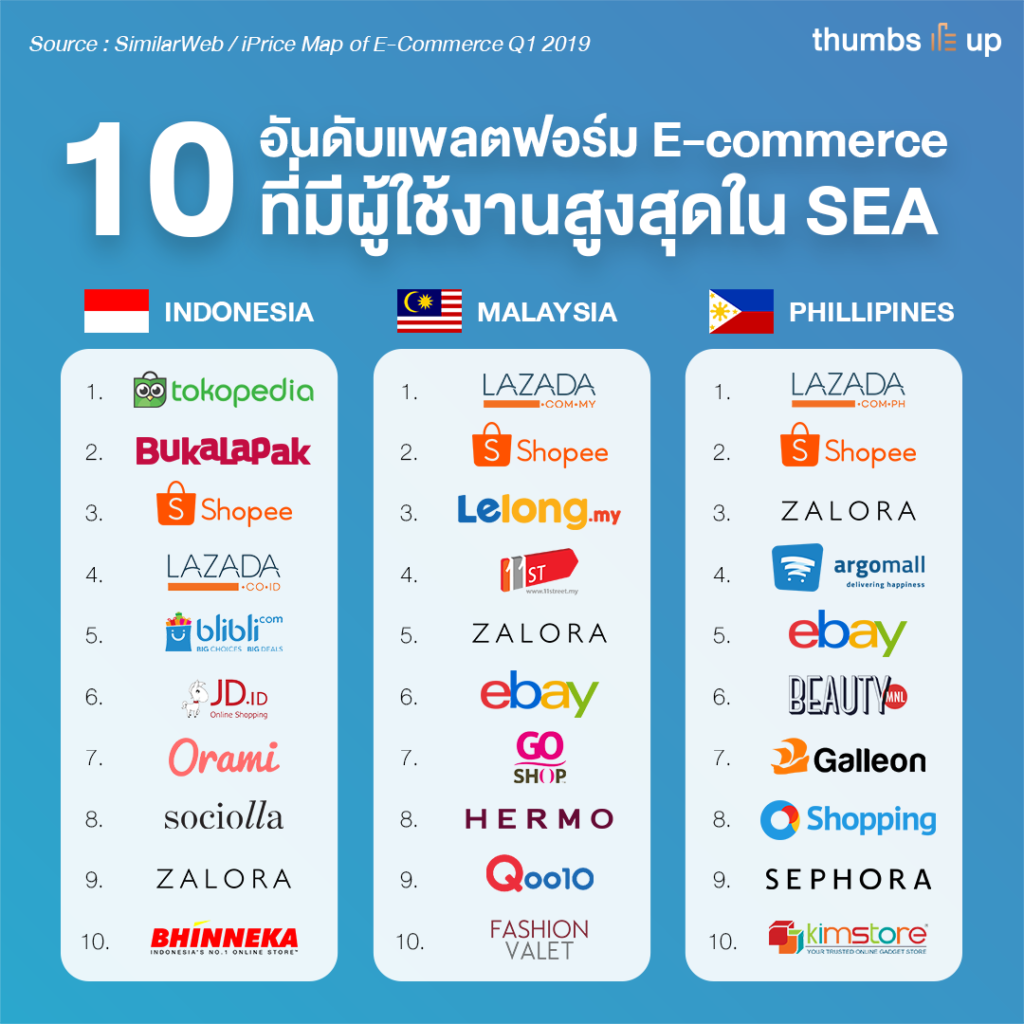 เพราะยังมีบางประเทศก็มีแพลตฟอร์มเจ้าถิ่นยังคงเป็นแชมป์อยู่ เช่น อินโดนีเซียที่มี Tokopedia ครองอันดับแพลตฟอร์มที่มีผู้เข้าชมสินค้ามากที่สุดอยู่รองลงมาคือ Bukalapak แล้วถึงจะตามมาด้วย Shopee ตบท้ายด้วย Lazada